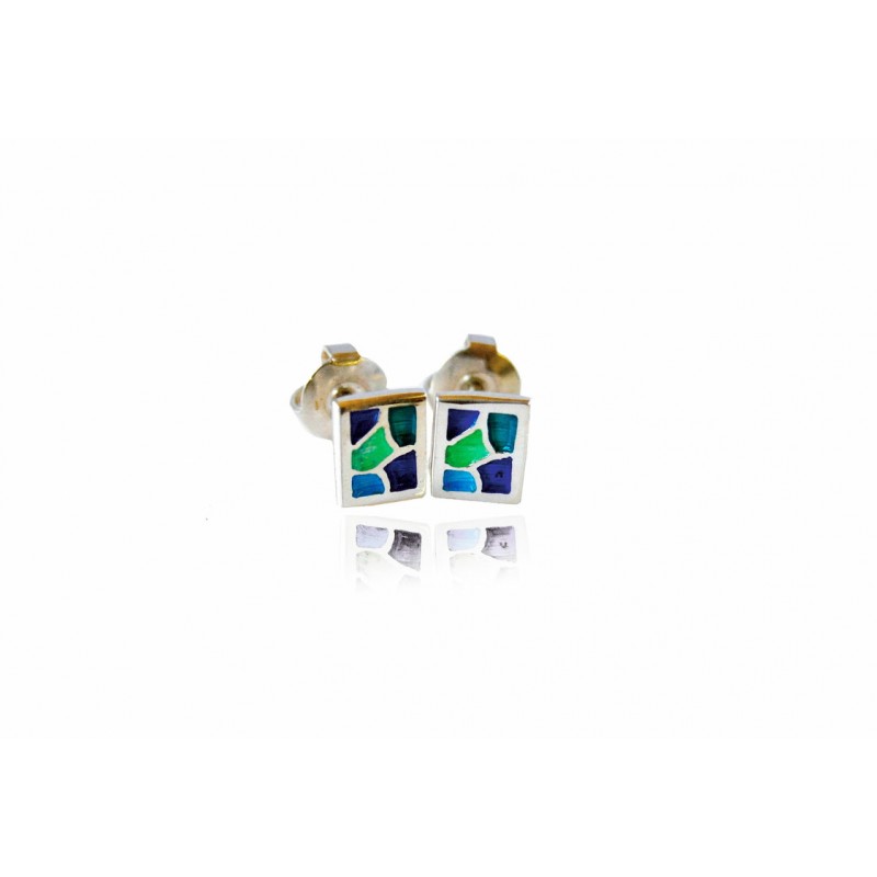 Eleganckie srebrne emaliowane kolczyki z kolekcji BCN-ART. Zainspirowana mozaikami Antonio Gaudiego kolekcja bazuje na sztuce emaliowania, czyli ozdabianiu biżuterii cienką, szklistą powłoką w różnych kolorach. Wymiary: 0.85 cm x 0.7 cm