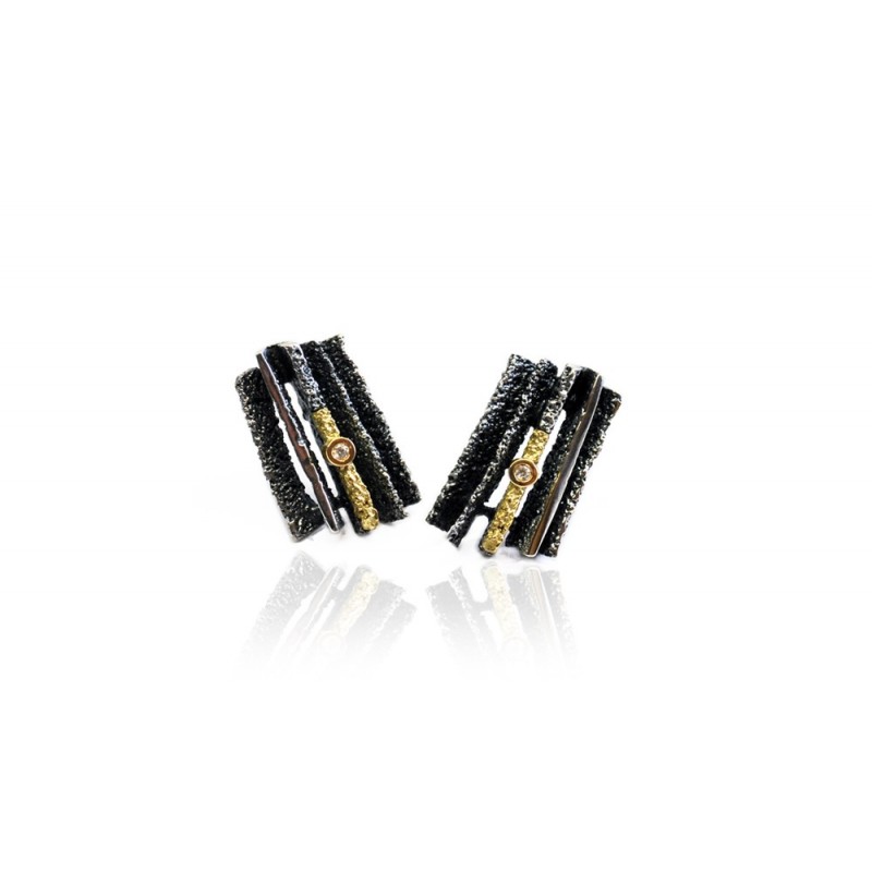Kolczyki Junc z brylantem. Kolczyki pochodzą z kolekcji Fuzja. To najwyżej klasyfikowana linia w ofercie katalońskiej firmy. Kolekcja ta powstaje w oparciu o najwyższej jakości srebro oraz 18-karatowe złoto. Kolczyki powstają pod szyldem znanego barcelońskiego projektanta Rogera Figueras.